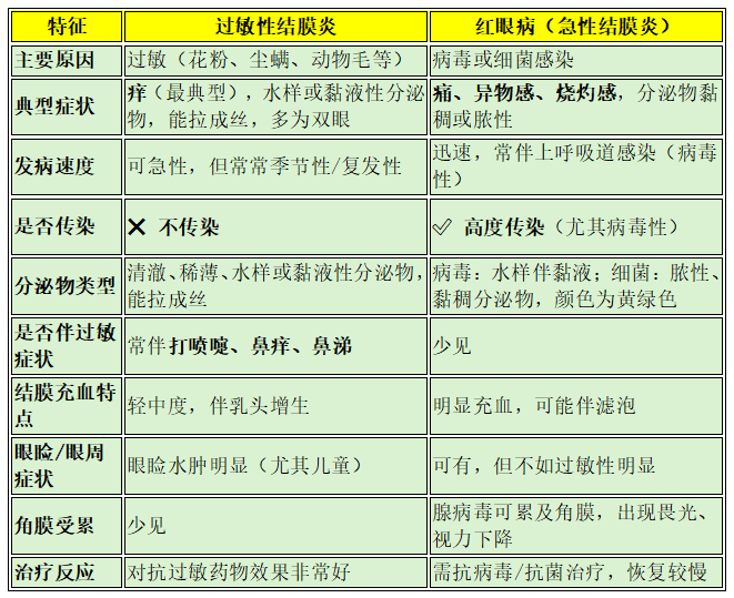 很多人会误将过敏性结膜炎当作传染性的“红眼病”(急性结膜炎),但两者有本质区别: